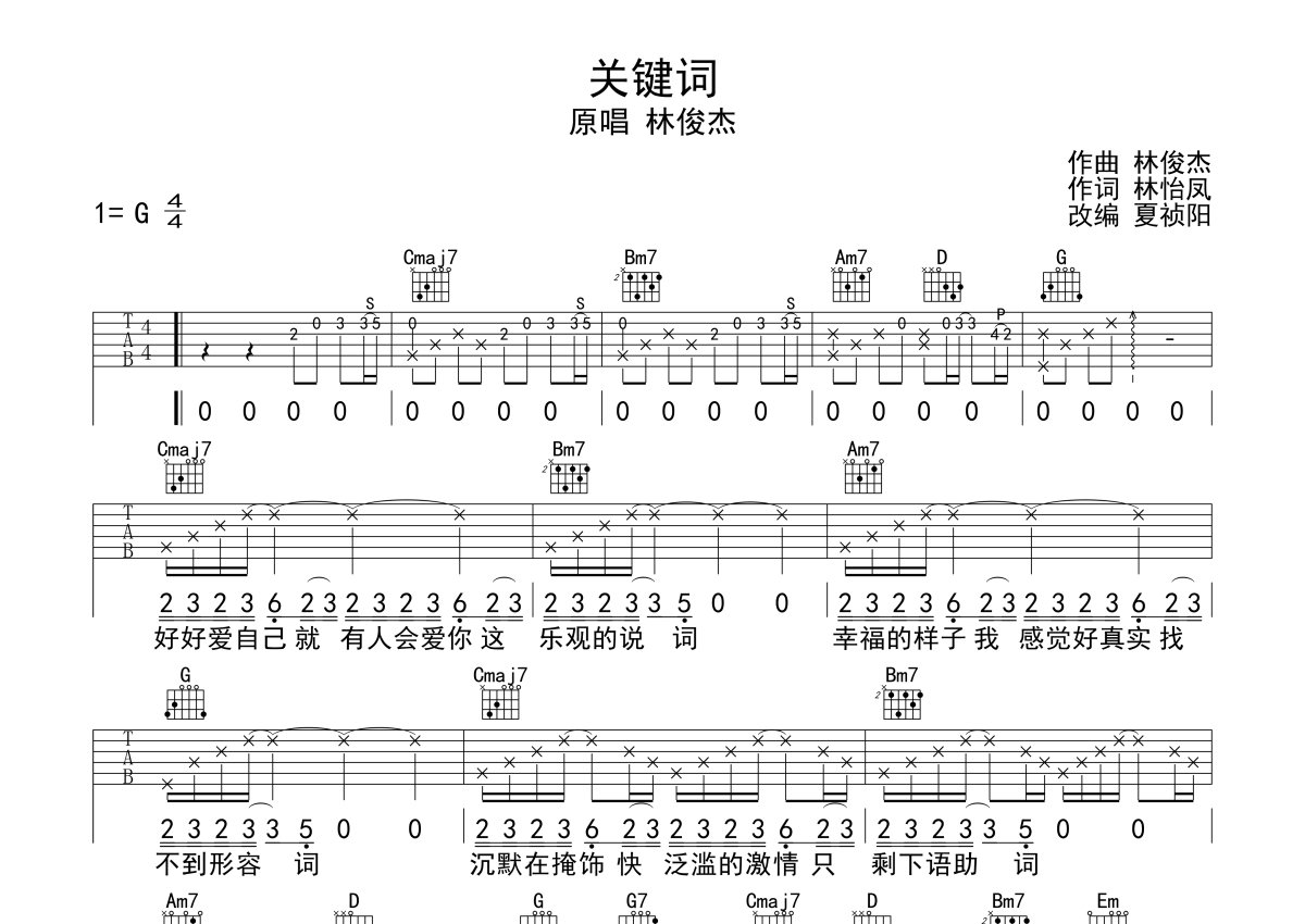 《关键词》是林俊杰演唱的一首歌曲,本吉他谱采用的是G调指法编配,这份吉他谱共有两张高清图谱,图谱由 @梦马音乐官方 编配上传,图谱使用六线谱编配,包含吉他和弦指法、简谱以及歌词部分,使用这份关键词吉他谱,可以让你更加方便地掌握这首歌曲的弹唱技巧,快来尝试吧。这首歌其实整体是比较简单的,只要把16分音符掌握了就好啦~其实整首歌弹出只需要4个和弦包括副歌也可以的,Cmaj7->Bm7->Am7->G,然后每个和弦基本只需要两个音循环~~ 而这两个音一个手指或者两个手指都能完成,所以整体难度是比较简单的,大家都可以试着练起来吧!。