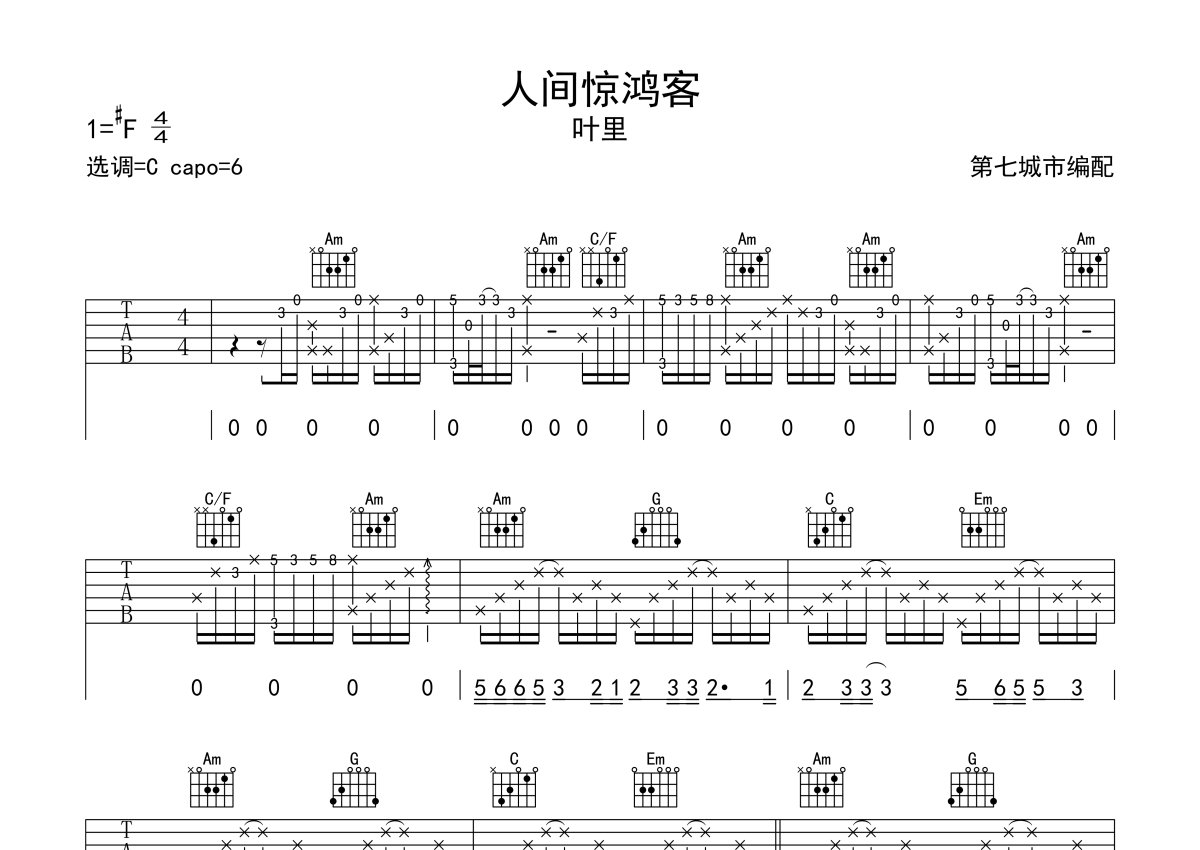 叶里《人间惊鸿客》吉他谱 - C调弹唱六线谱