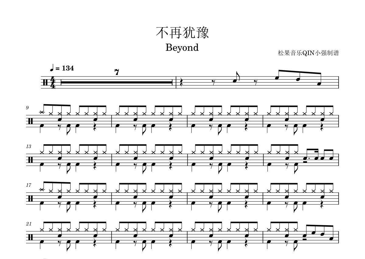 《不再犹豫》是Beyond演唱的一首歌曲,拍号为4/4拍,这份架子鼓谱共有三张高清图谱,图谱由 @松果音乐QIN小强 编配上传,图谱使用五线谱编配,使用这份不再犹豫架子鼓谱,你将能够轻松地敲打出这首Beyond的不再犹豫,快来尝试吧。《不再犹豫》是Beyond演唱的流行摇滚歌曲,由梁美薇作词,黄家驹作曲,Beyond编曲,收录于Beyond的第七张粤语专辑《Deliberate 犹豫》中,于1991年9月6日随专辑通过新艺宝唱片发行。