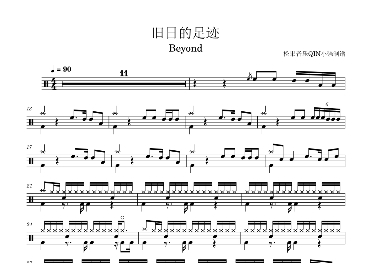《旧日的足迹》是Beyond演唱的一首歌曲,拍号为4/4拍,这份架子鼓谱共有三张高清图谱,图谱由 @松果音乐QIN小强 编配上传,图谱使用五线谱编配,使用这份旧日的足迹架子鼓谱,你将能够轻松地敲打出这首Beyond的旧日的足迹,快来尝试吧。《旧日的足迹》是中国香港摇滚乐队Beyond演唱的一首粤语歌曲,由叶世荣填词,黄家驹谱曲,Beyond编曲。该歌曲最早在Beyond1985年以地下乐队身份举办的"永远等待"演唱会上表演,该版本收录在Beyond1986年3月自资发行的盒带专辑《再见理想》中。