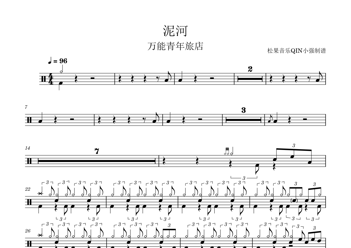《泥河》是万能青年旅店演唱的一首歌曲,拍号为4/4拍,这份架子鼓谱共有四张高清图谱,图谱由 @松果音乐QIN小强 编配上传,图谱使用五线谱编配,使用这份泥河架子鼓谱,你将能够轻松地敲打出这首万能青年旅店的泥河,快来尝试吧。《泥河》是万能青年旅店乐队于2020年12月22日发行的专辑《冀西南林路行》中的第二首曲目。