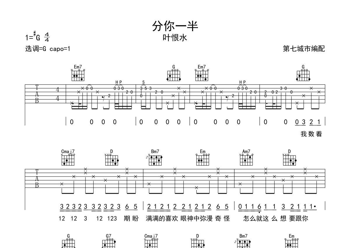 《分你一半》是叶恨水演唱的一首歌曲,本吉他谱采用的是G调指法编配,这份吉他谱共有两张高清图谱,图谱由 @第七城市 编配上传,图谱使用六线谱编配,包含吉他和弦指法、简谱以及歌词部分,使用这份分你一半吉他谱,可以让你更加方便地掌握这首歌曲的弹唱技巧,快来尝试吧。叶恨水《分你一半》吉他谱_G调吉他弹唱谱。