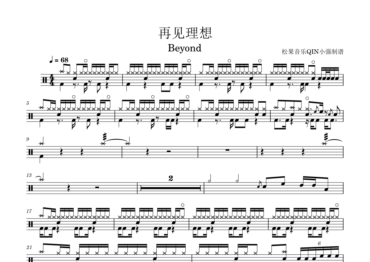 《再见理想》是BEYOND演唱的一首歌曲,拍号为4/4拍,这份架子鼓谱共有两张高清图谱,图谱由 @松果音乐QIN小强 编配上传,图谱使用五线谱编配,使用这份再见理想架子鼓谱,你将能够轻松地敲打出这首BEYOND的再见理想,快来尝试吧。《再见理想》是Beyond演唱的粤语歌曲,由黄家驹作曲并与叶世荣、黄家强、黄贯中共同填词,Beyond编曲。