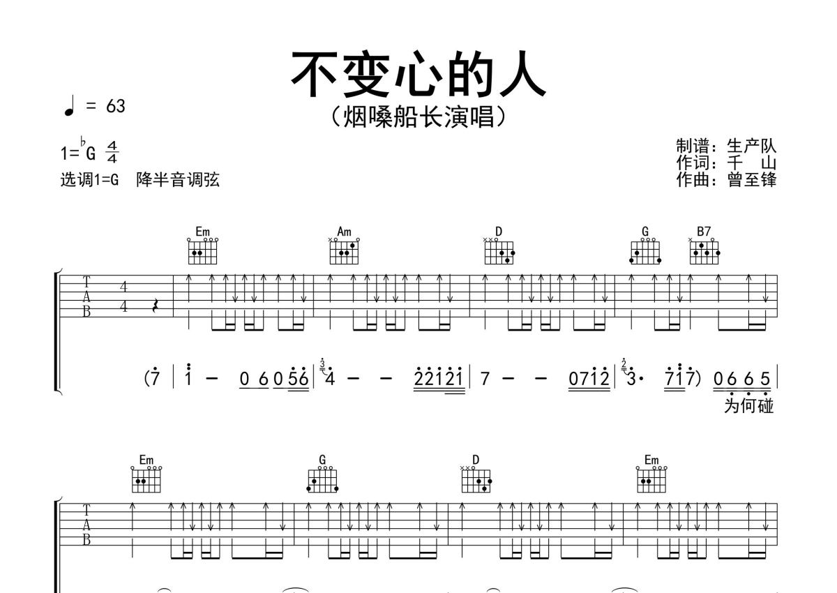 《不变心的人》是烟嗓船长演唱的一首歌曲,精编完美版,拍号为4/4拍,歌曲速度为每分钟63拍,歌曲原调为Gb调,但由于原调指法比较难,为了方便弹奏,本吉他谱采用的是G调指法编配,降半音调弦弹奏即为原调,当然也可以根据自己的音域决定是否调弦,这份吉他谱共有两张高清图谱,图谱由 @生产队 编配上传,图谱使用六线谱编配,包含吉他和弦指法、简谱以及歌词部分,使用这份不变心的人吉他谱,可以让你更加方便地掌握这首歌曲的弹唱技巧,快来尝试吧。烟嗓船长演唱的歌曲《不变心的人》原版吉他谱,完整的前奏、间奏solo编配,精编完美版,优质推荐!。