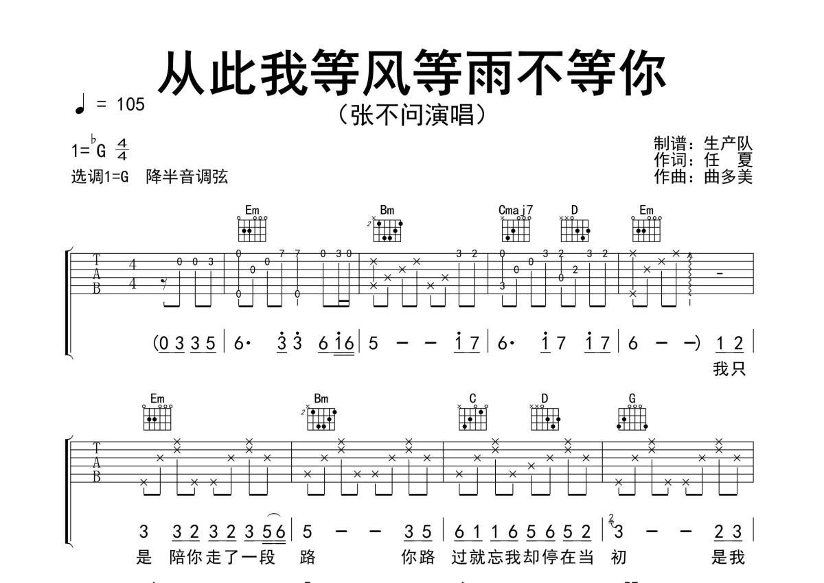 《从此我等风等雨不等你》是张不问演唱的一首歌曲,精编完美版,拍号为4/4拍,歌曲速度为每分钟105拍,歌曲原调为Gb调,但由于原调指法比较难,为了方便弹奏,本吉他谱采用的是G调指法编配,降半音调弦弹奏即为原调,当然也可以根据自己的音域决定是否调弦,这份吉他谱共有两张高清图谱,图谱由 @生产队 编配上传,图谱使用六线谱编配,包含吉他和弦指法、简谱以及歌词部分,使用这份从此我等风等雨不等你吉他谱,可以让你更加方便地掌握这首歌曲的弹唱技巧,快来尝试吧。张不问演唱的歌曲《从此我等风等雨不等你》原版吉他谱,完整的前奏、间奏、尾奏solo编配,精编完美版,优质推荐!。