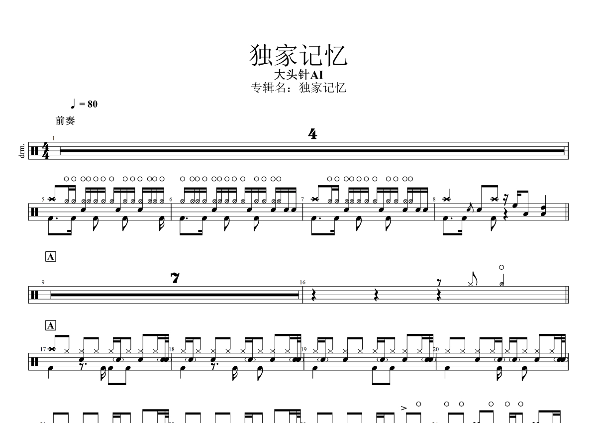 大头针Al《独家记忆》架子鼓谱