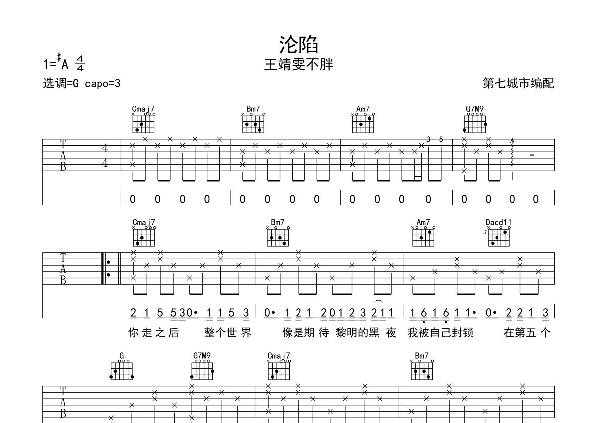 王靖雯不胖《沦陷》吉他谱 - G调弹唱六线谱