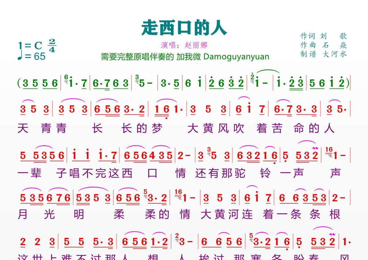 《走西口的人》是赵丽娜演唱的一首歌曲,拍号为2/4拍,歌曲速度为每分钟65拍,这份简谱共有一张高清图谱,图谱由 @临海雪原 编配上传。