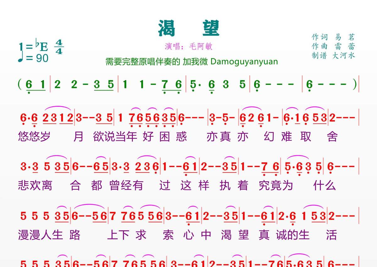 《渴望》是毛阿敏演唱的一首歌曲,拍号为4/4拍,歌曲速度为每分钟90拍,这份简谱共有一张高清图谱,图谱由 @临海雪原 编配上传。