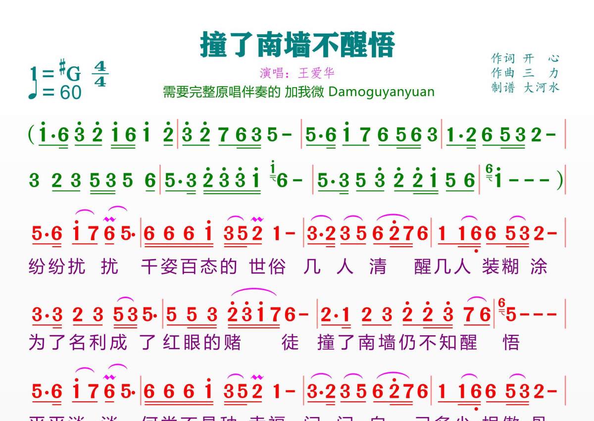 《撞了南墙不醒悟》是王爱华演唱的一首歌曲,拍号为4/4拍,歌曲速度为每分钟60拍,这份简谱共有一张高清图谱,图谱由 @临海雪原 编配上传。