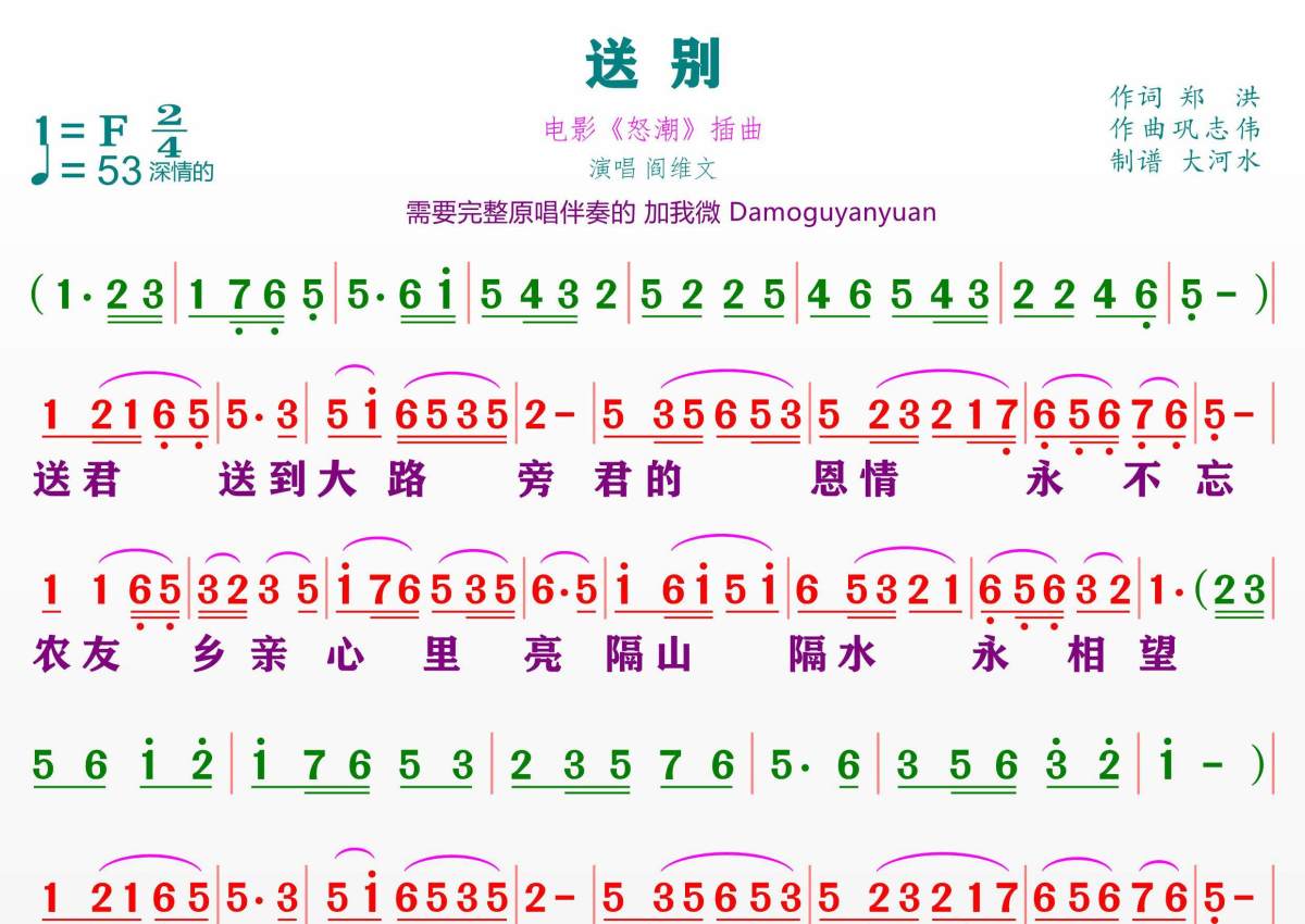 怒潮主题曲送别简谱 - 阎维文演唱