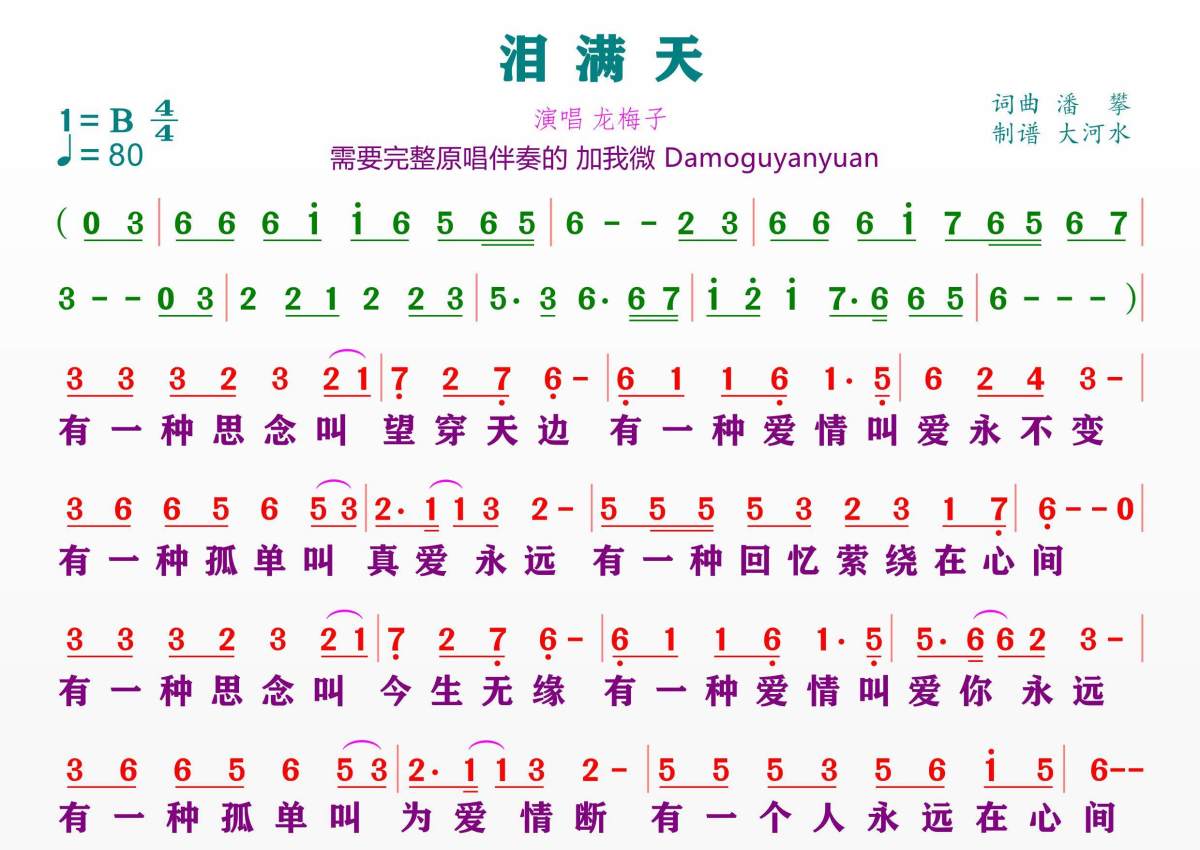 泪满天简谱 - 龙梅子演唱