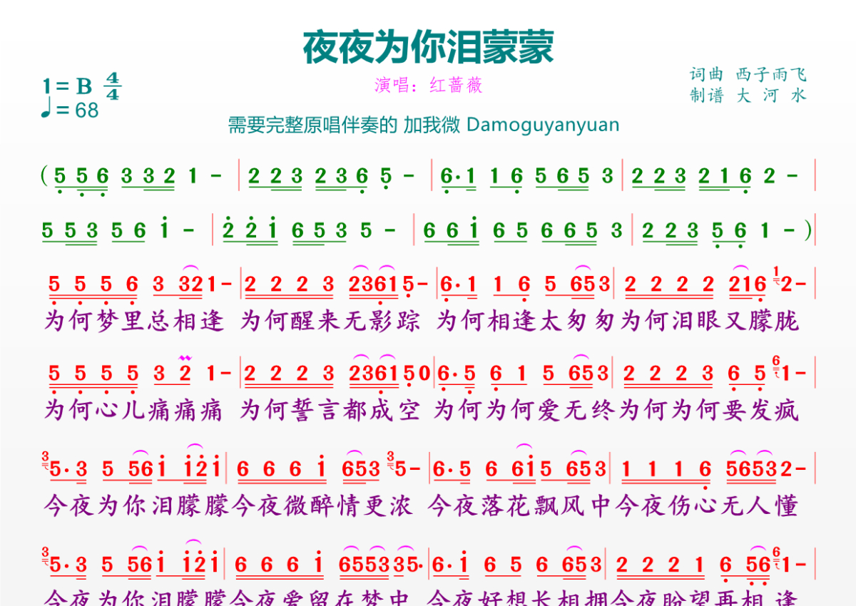 《夜夜为你泪蒙蒙》是红蔷薇演唱的一首歌曲,拍号为4/4拍,歌曲速度为每分钟68拍,这份简谱共有一张高清图谱,图谱由 @临海雪原 编配上传。