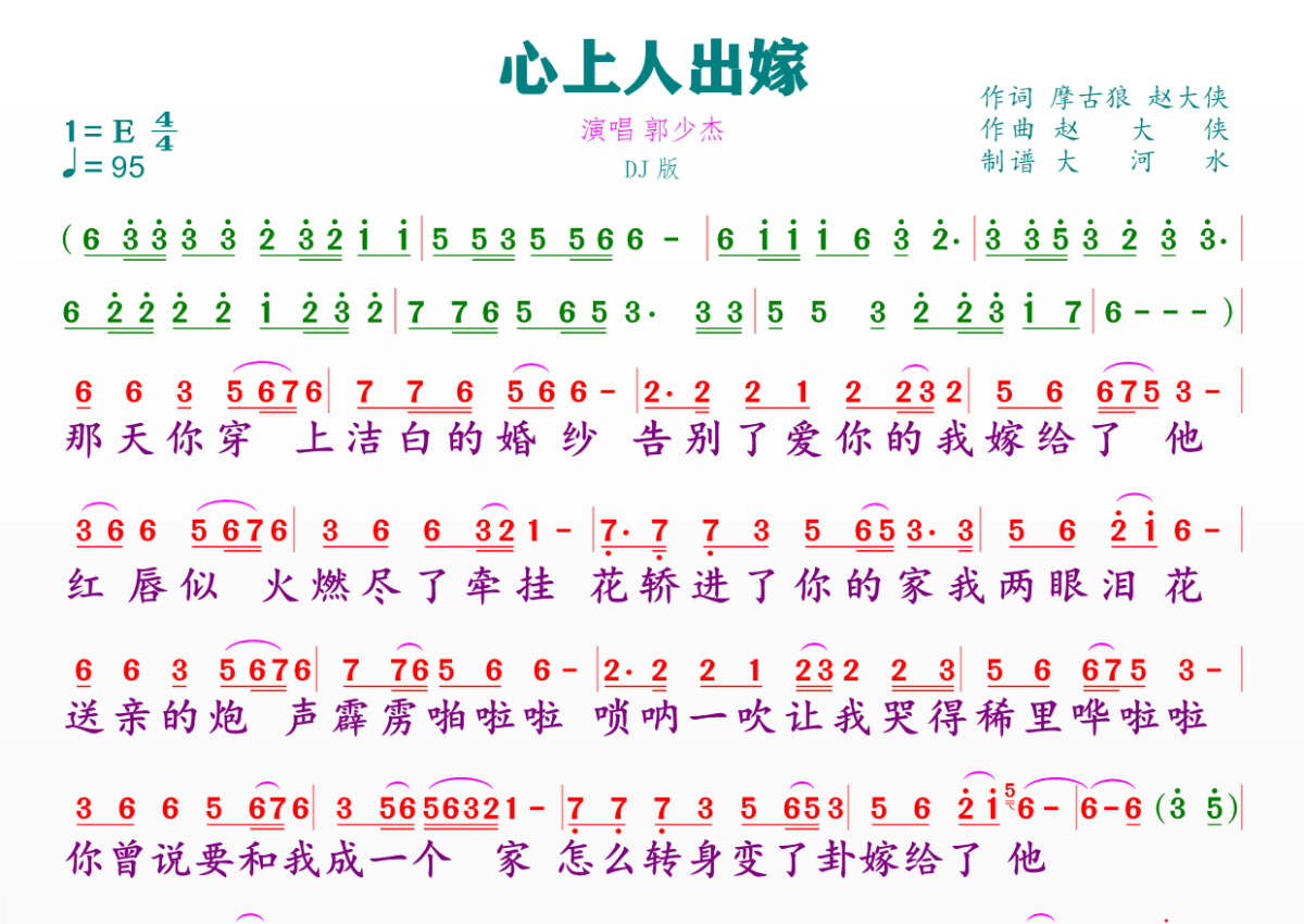 《心上人出嫁》是郭少杰演唱的一首歌曲,拍号为4/4拍,歌曲速度为每分钟95拍,这份简谱共有一张高清图谱,图谱由 @临海雪原 编配上传。