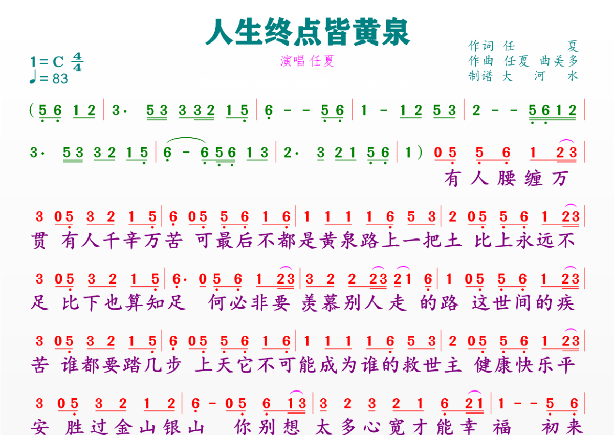 《人生终点皆黄泉》简谱 - 任夏