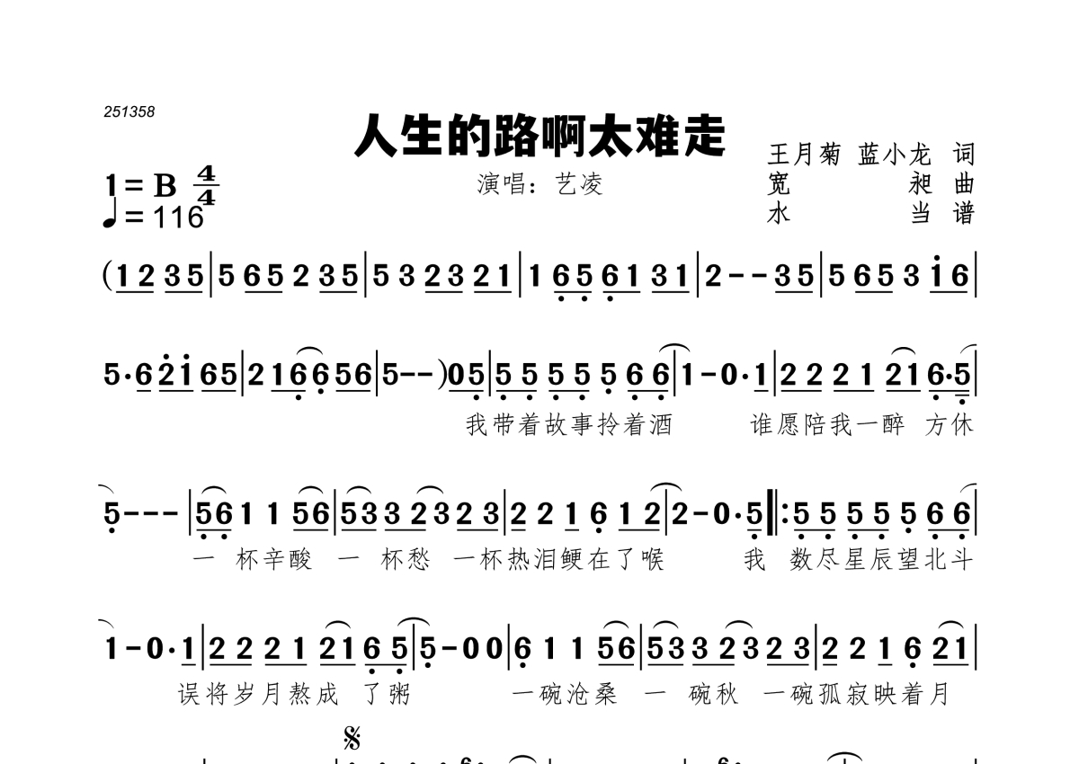 《人生的路啊太难走》是艺凌演唱的一首歌曲,拍号为4/4拍,歌曲速度为每分钟116拍,这份简谱共有一张高清图谱,图谱由 @水当 编配上传。