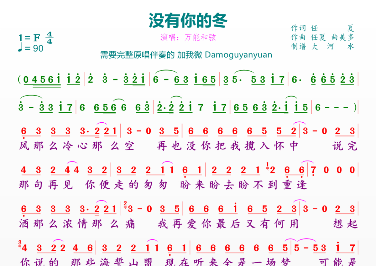 《没有你的冬》是万能和弦演唱的一首歌曲,拍号为4/4拍,歌曲速度为每分钟90拍,这份简谱共有一张高清图谱,图谱由 @临海雪原 编配上传。