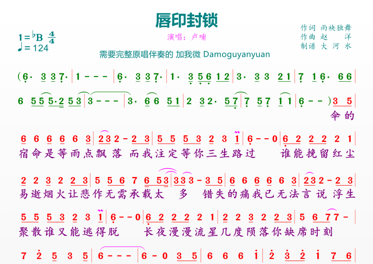《唇印封锁》是卢喃演唱的一首歌曲,拍号为4/4拍,歌曲速度为每分钟124拍,这份简谱共有一张高清图谱,图谱由 @临海雪原 编配上传。