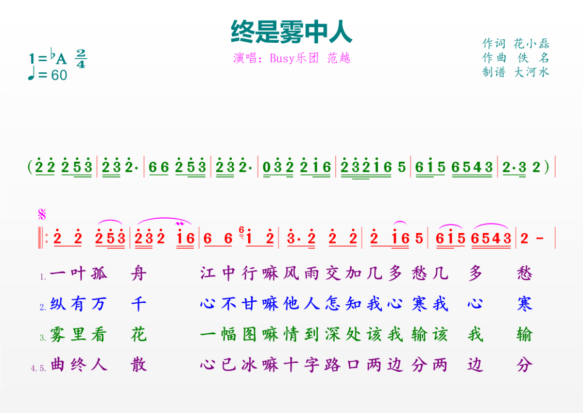 《终是雾中人》是Busy乐团 范越演唱的一首歌曲,拍号为2/4拍,歌曲速度为每分钟60拍,这份简谱共有一张高清图谱,图谱由 @临海雪原 编配上传。