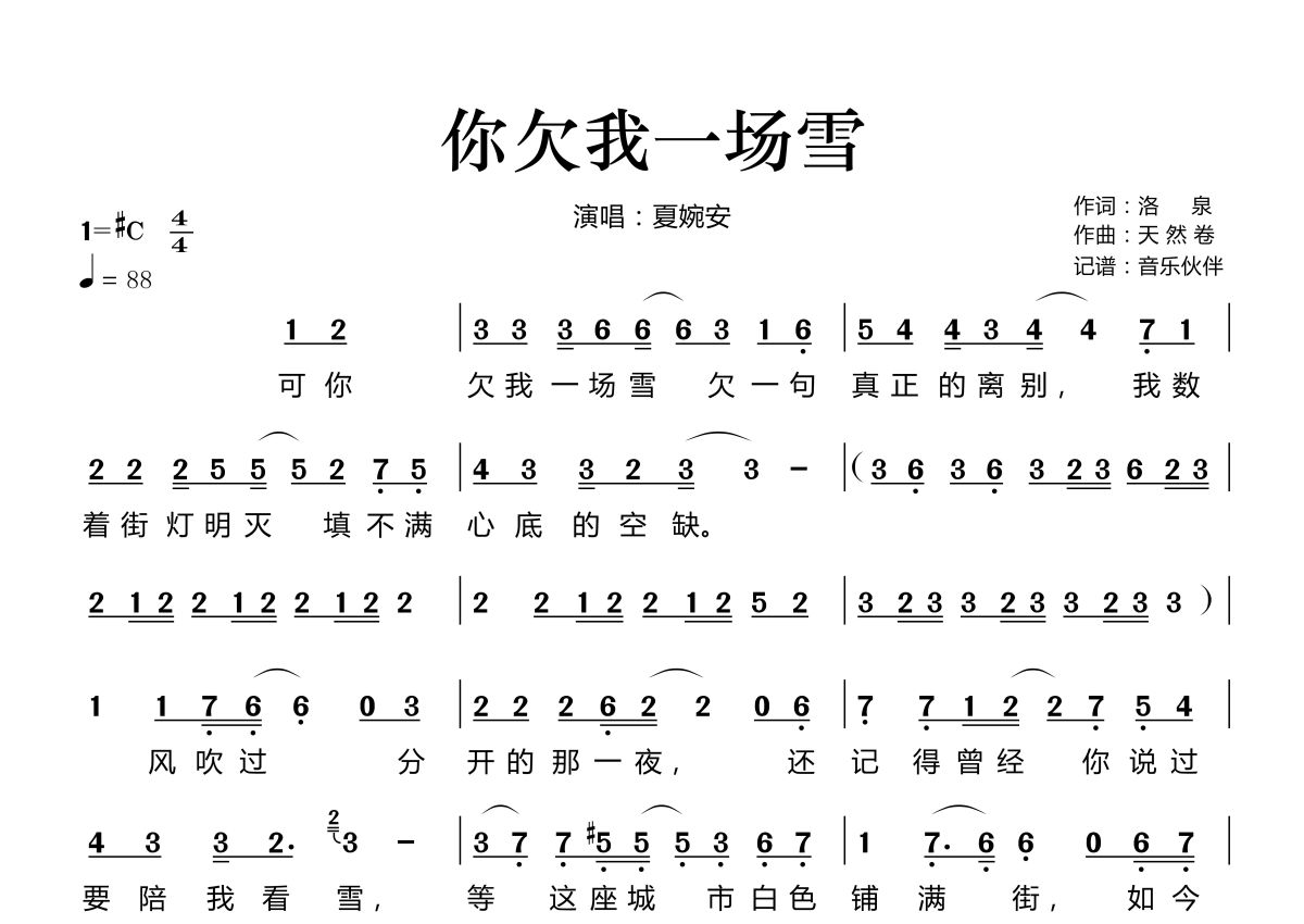 《你欠我一场雪》是夏婉安演唱的一首歌曲,拍号为4/4拍,歌曲速度为每分钟88拍,这份简谱共有两张高清图谱,图谱由 @音乐伙伴 编配上传。