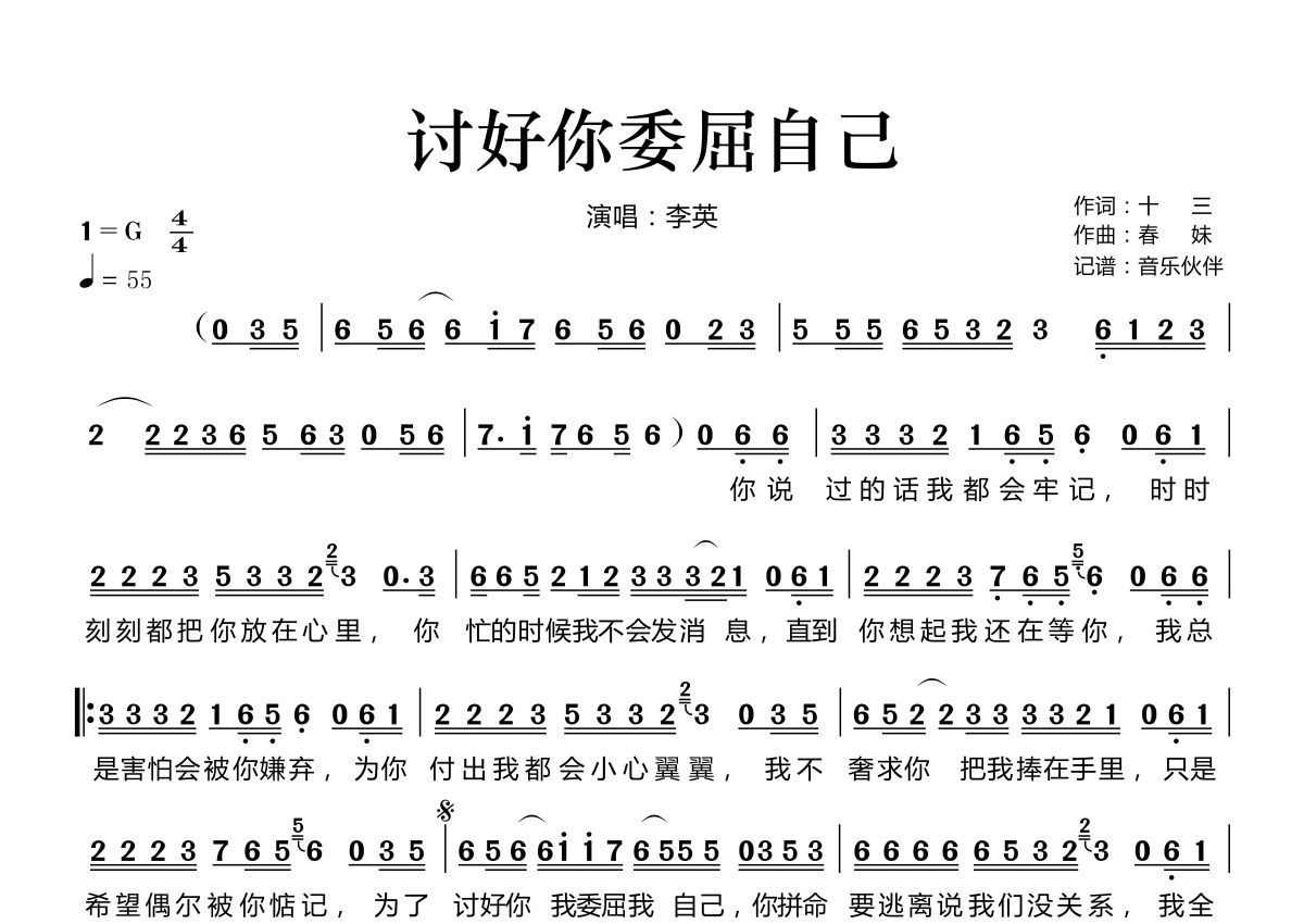 《讨好你委屈自己》是李英演唱的一首歌曲,拍号为4/4拍,歌曲速度为每分钟55拍,这份简谱共有一张高清图谱,图谱由 @音乐伙伴 编配上传。