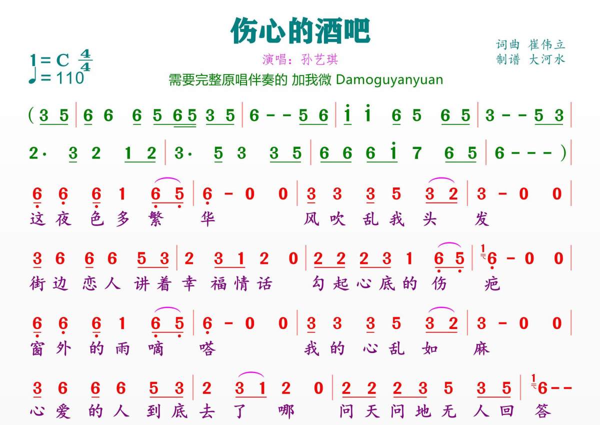 《伤心的酒吧》是孙艺琪演唱的一首歌曲,拍号为4/4拍,歌曲速度为每分钟110拍,这份简谱共有一张高清图谱,图谱由 @临海雪原 编配上传。