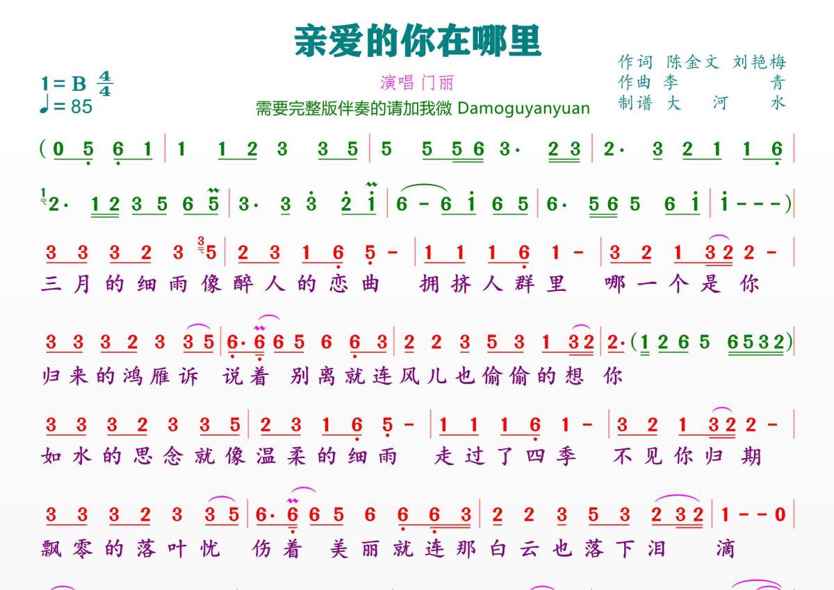 亲爱的你在哪里简谱 - 门丽演唱