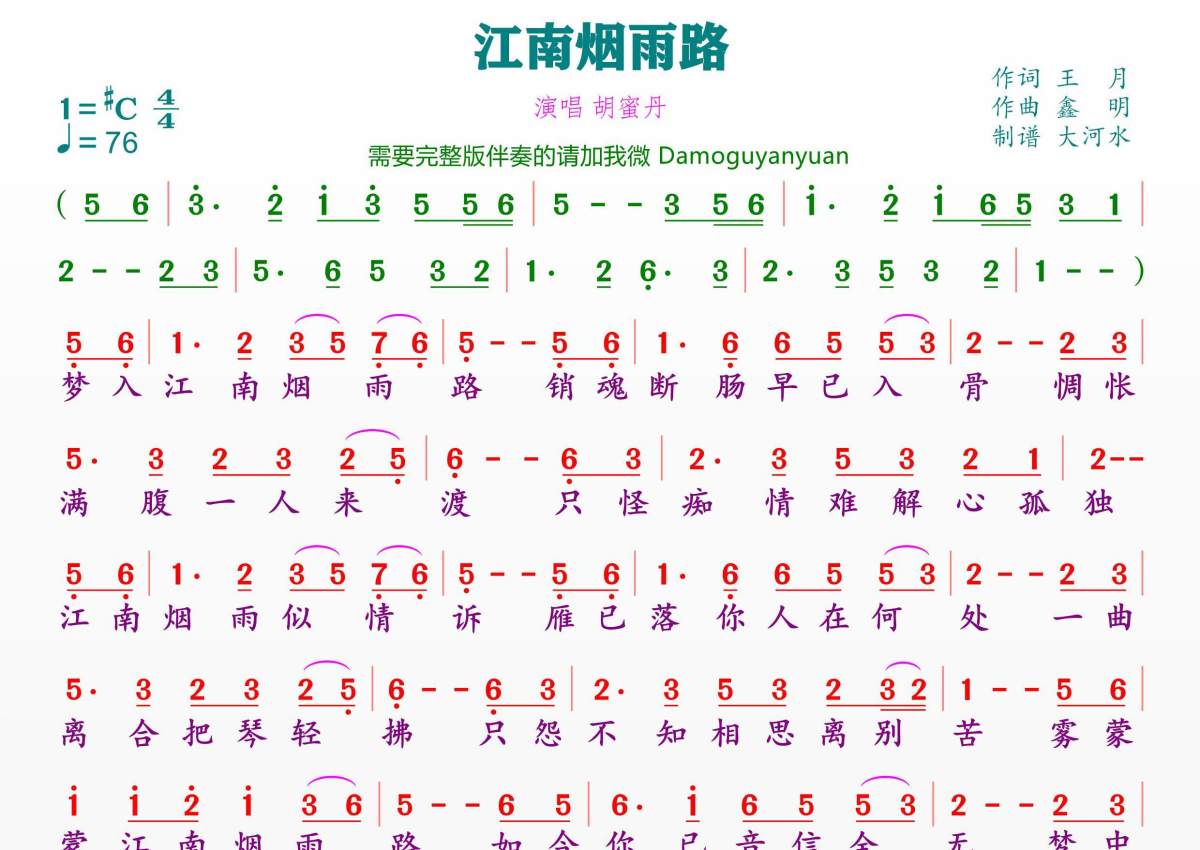 《江南烟雨路》是胡蜜丹演唱的一首歌曲,拍号为4/4拍,歌曲速度为每分钟76拍,这份简谱共有一张高清图谱,图谱由 @临海雪原 编配上传。
