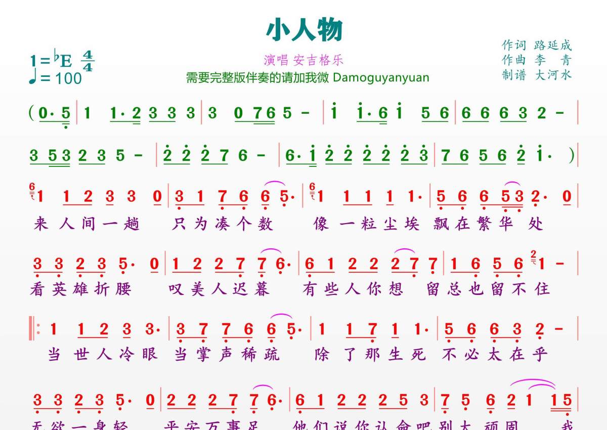 《小人物》是安吉格尔演唱的一首歌曲,拍号为4/4拍,歌曲速度为每分钟100拍,这份简谱共有一张高清图谱,图谱由 @临海雪原 编配上传。