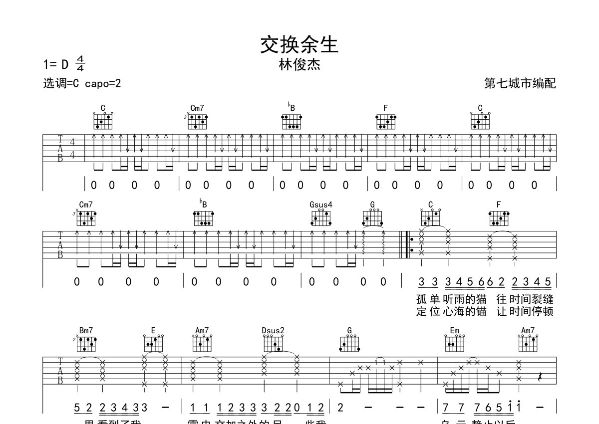《交换余生》是林俊杰演唱的一首歌曲,本吉他谱采用的是C调指法编配,这份吉他谱共有两张高清图谱,图谱由 @第七城市 编配上传,图谱使用六线谱编配,包含吉他和弦指法、简谱以及歌词部分,使用这份交换余生吉他谱,可以让你更加方便地掌握这首歌曲的弹唱技巧,快来尝试吧。林俊杰《交换余生》吉他谱_C调吉他弹唱谱。