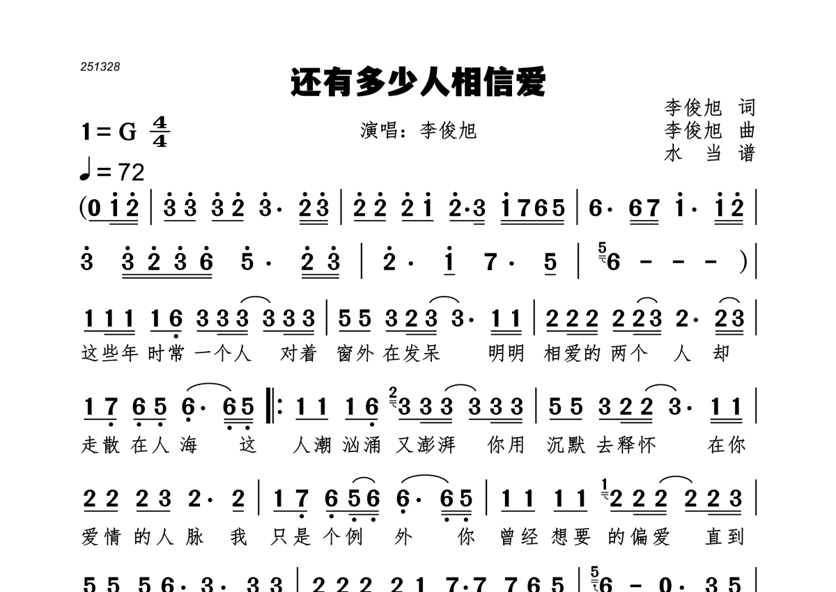 《还有多少人相信爱》是李俊旭演唱的一首歌曲,拍号为4/4拍,歌曲速度为每分钟72拍,这份简谱共有一张高清图谱,图谱由 @水当 编配上传。
