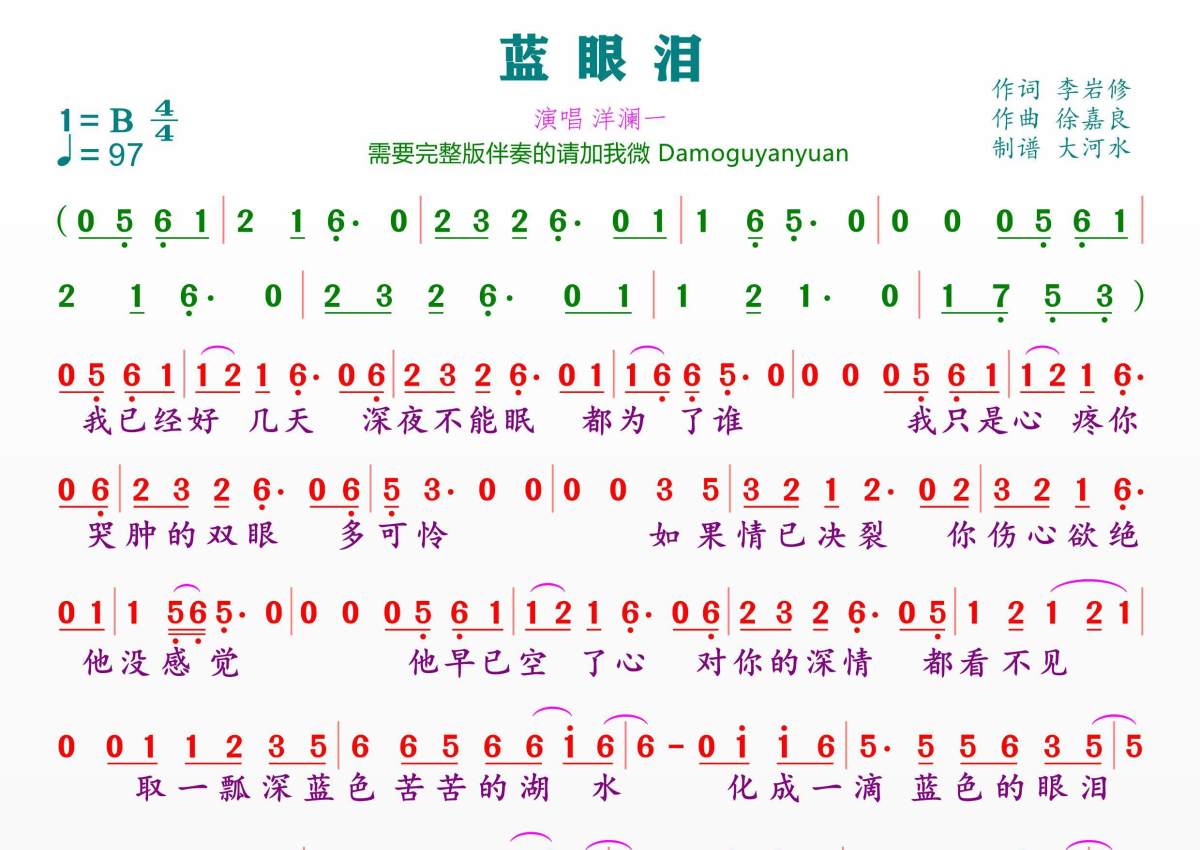 《蓝眼泪》是洋澜一演唱的一首歌曲,拍号为4/4拍,歌曲速度为每分钟97拍,这份简谱共有一张高清图谱,图谱由 @临海雪原 编配上传。