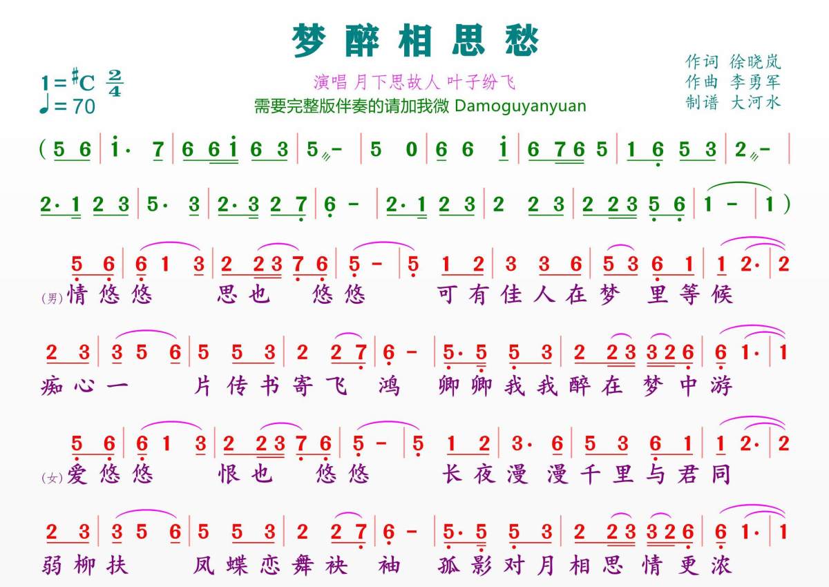 《梦醉相思愁》是月下思故人 叶子纷飞演唱的一首歌曲,拍号为2/4拍,歌曲速度为每分钟70拍,这份简谱共有一张高清图谱,图谱由 @临海雪原 编配上传。