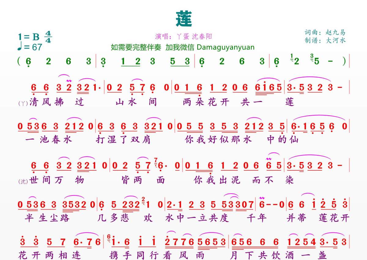 《莲》是丫蛋沈春阳演唱的一首歌曲,拍号为4/4拍,歌曲速度为每分钟67拍,这份简谱共有一张高清图谱,图谱由 @临海雪原 编配上传。