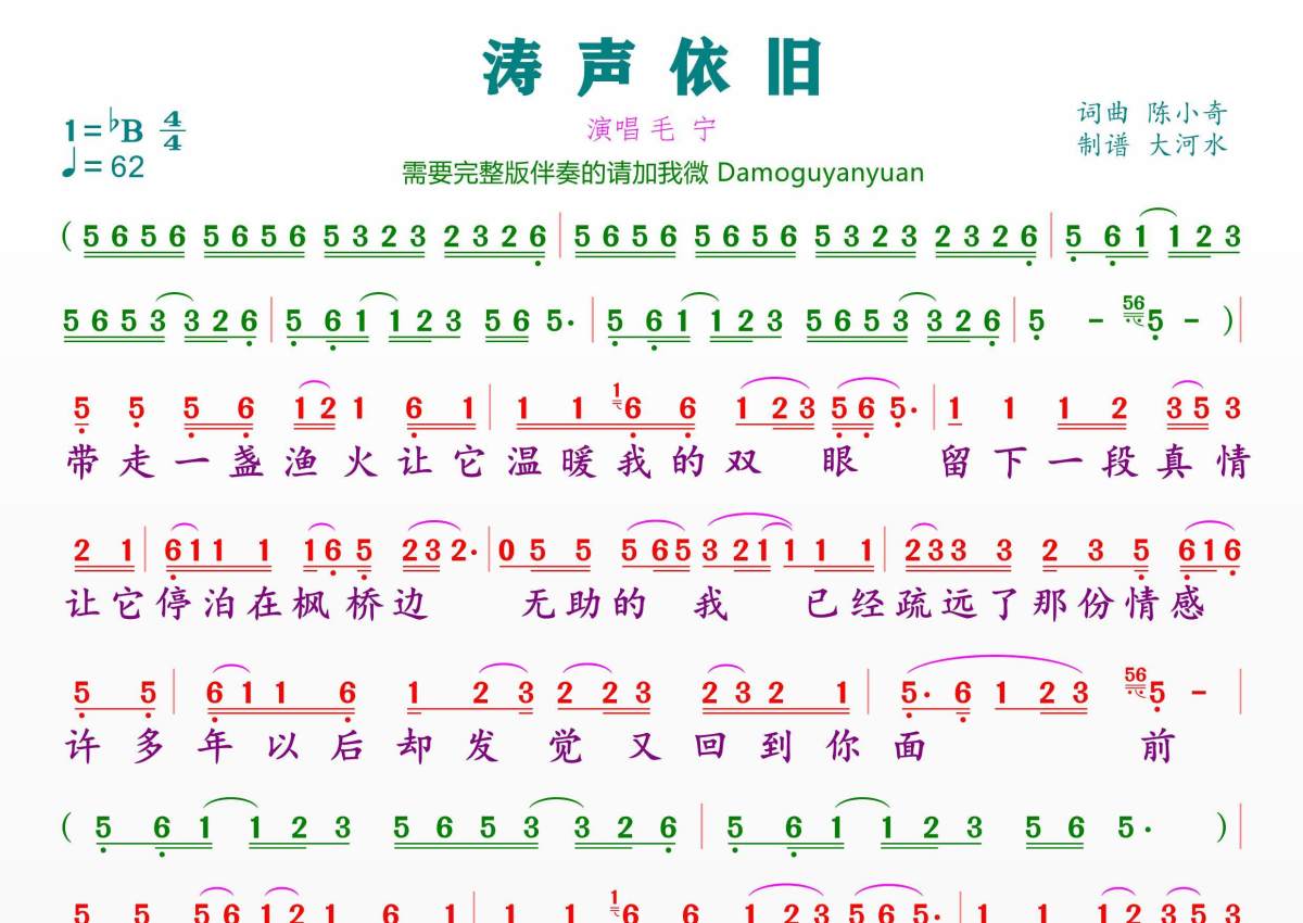 《涛声依旧》是毛宁演唱的一首歌曲,拍号为4/4拍,歌曲速度为每分钟62拍,这份简谱共有一张高清图谱,图谱由 @临海雪原 编配上传。