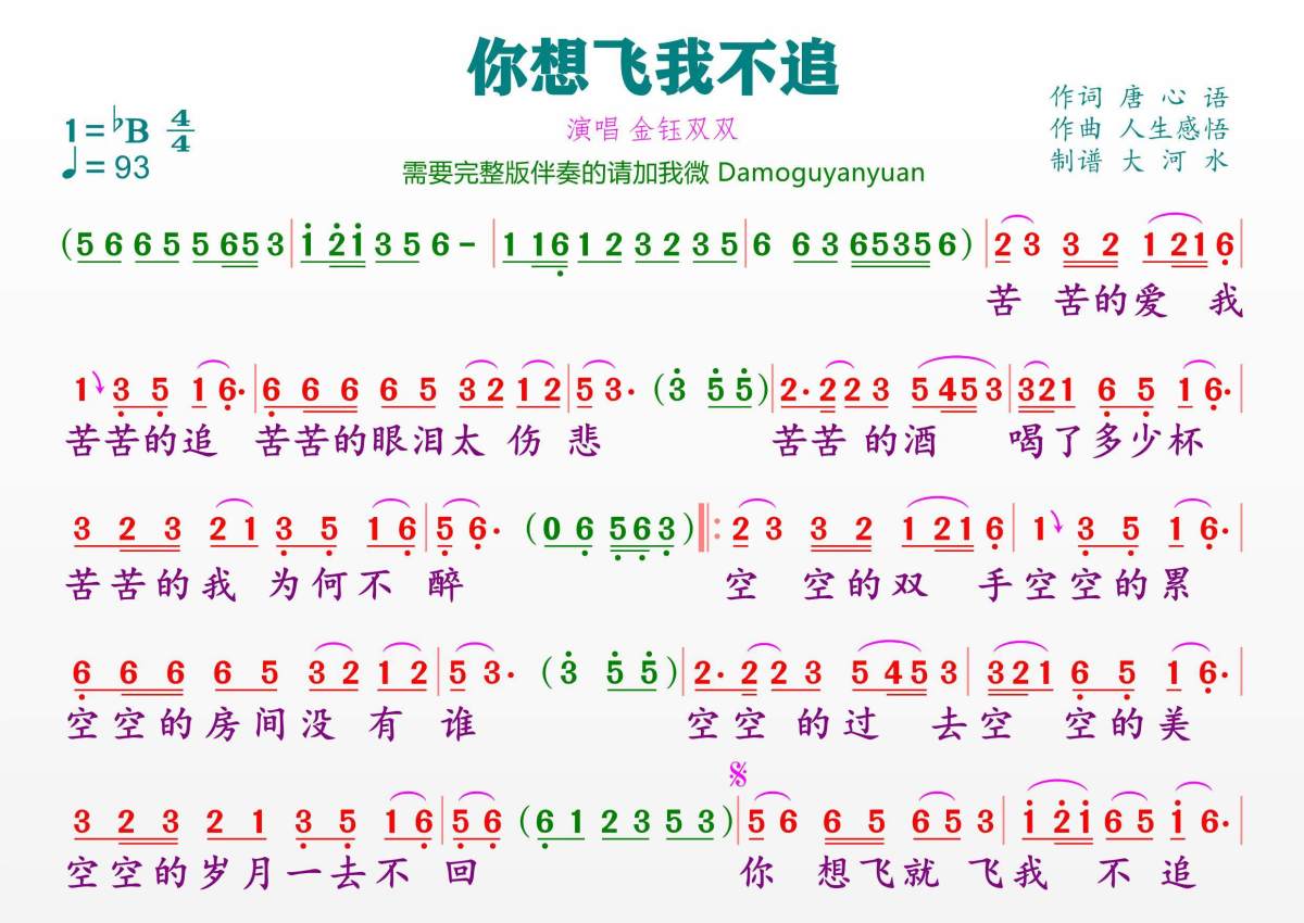 《你想飞我不追》是金钰双双演唱的一首歌曲,拍号为4/4拍,歌曲速度为每分钟93拍,这份简谱共有一张高清图谱,图谱由 @临海雪原 编配上传。