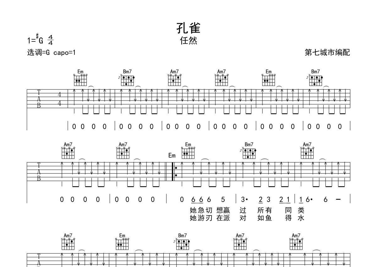 任然《孔雀》吉他谱 - G调弹唱六线谱