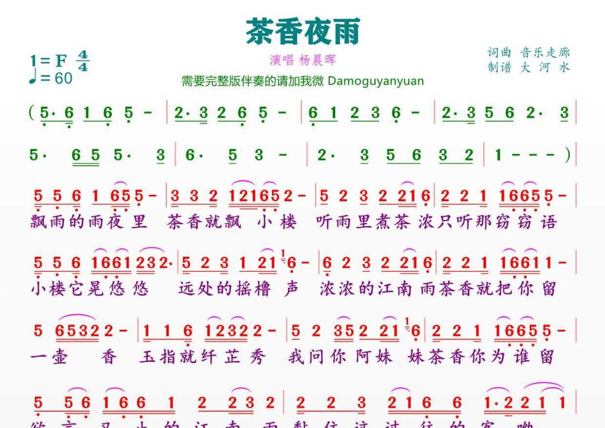 《茶香夜雨》是杨晨晖演唱的一首歌曲,拍号为4/4拍,歌曲速度为每分钟60拍,这份简谱共有一张高清图谱,图谱由 @临海雪原 编配上传。