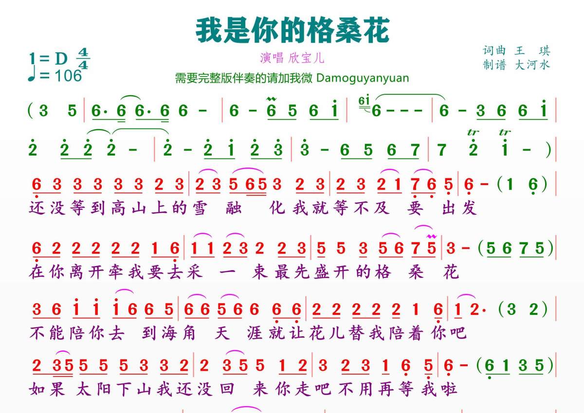 《我是你的格桑花》是欣宝儿演唱的一首歌曲,拍号为4/4拍,歌曲速度为每分钟106拍,这份简谱共有一张高清图谱,图谱由 @临海雪原 编配上传。