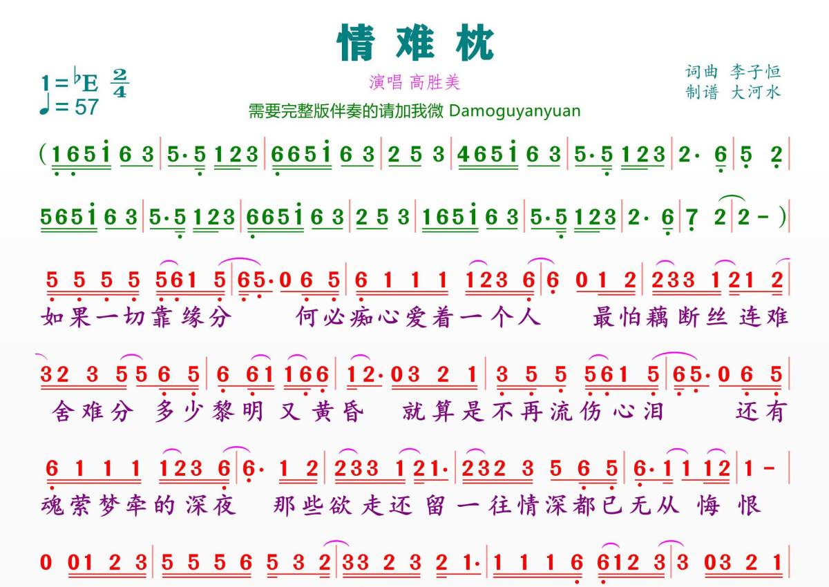 《情难枕》是高胜美演唱的一首歌曲,拍号为2/4拍,歌曲速度为每分钟57拍,这份简谱共有一张高清图谱,图谱由 @临海雪原 编配上传。