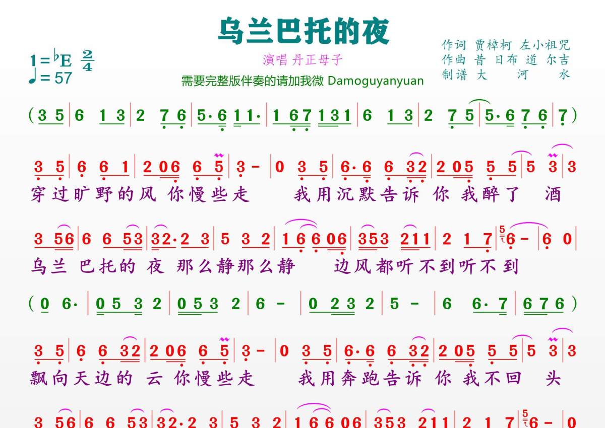 《乌兰巴托的夜》是丹正母子演唱的一首歌曲,拍号为2/4拍,歌曲速度为每分钟57拍,这份简谱共有一张高清图谱,图谱由 @临海雪原 编配上传。