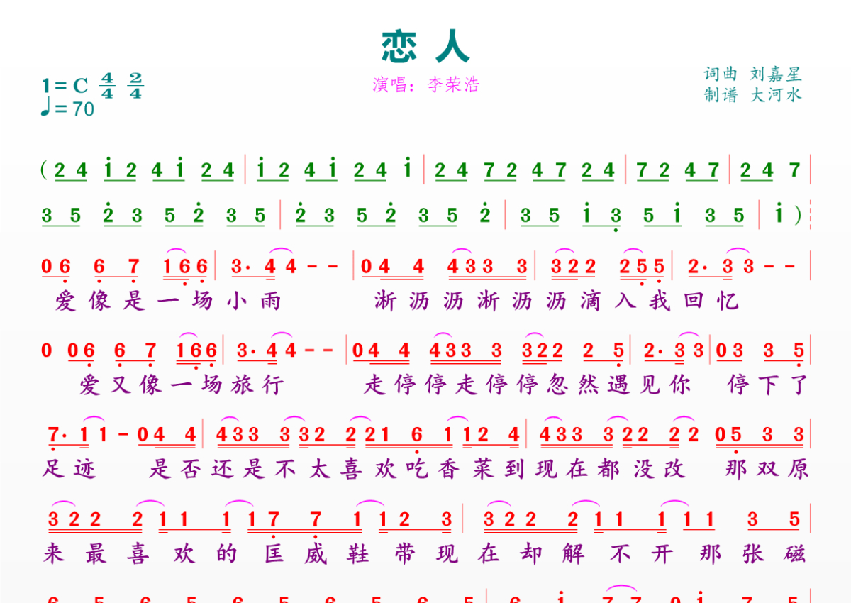 《恋人》是李荣浩演唱的一首歌曲,拍号为4/4拍,歌曲速度为每分钟70拍,这份简谱共有一张高清图谱,图谱由 @临海雪原 编配上传。