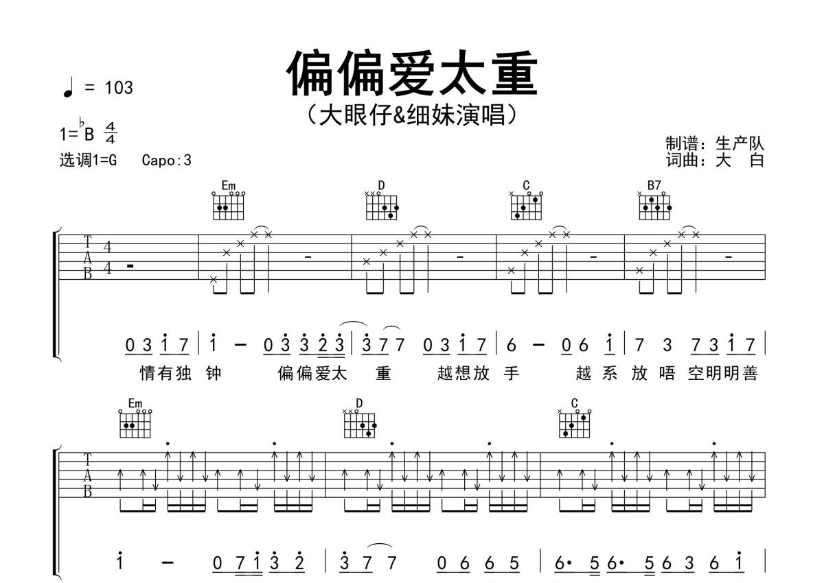 《偏偏爱太重》是大眼仔&细妹演唱的一首歌曲,精编完美版,拍号为4/4拍,歌曲速度为每分钟103拍,歌曲原调为Bb调,但由于原调指法比较难,为了方便弹奏,本吉他谱采用的是G调指法编配,变调夹3品弹奏即为原调,当然也可以根据自己的音域改变变调夹位置,或者通过改变和弦调性,以方便自己弹奏,这份吉他谱共有三张高清图谱,图谱由 @生产队 编配上传,图谱使用六线谱编配,包含吉他和弦指法、简谱以及歌词部分,使用这份偏偏爱太重吉他谱,可以让你更加方便地掌握这首歌曲的弹唱技巧,快来尝试吧。大眼仔&细妹演唱的歌曲《偏偏爱太重》原版吉他谱,含间奏solo,说唱rap编配,精编完美版,优质推荐!。