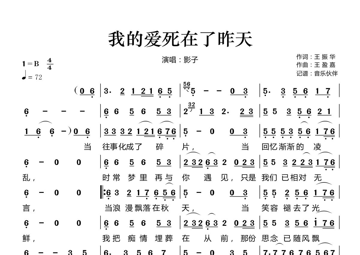 《我的爱死在了昨天》是影子演唱的一首歌曲,拍号为4/4拍,歌曲速度为每分钟72拍,这份简谱共有一张高清图谱,图谱由 @音乐伙伴 编配上传。