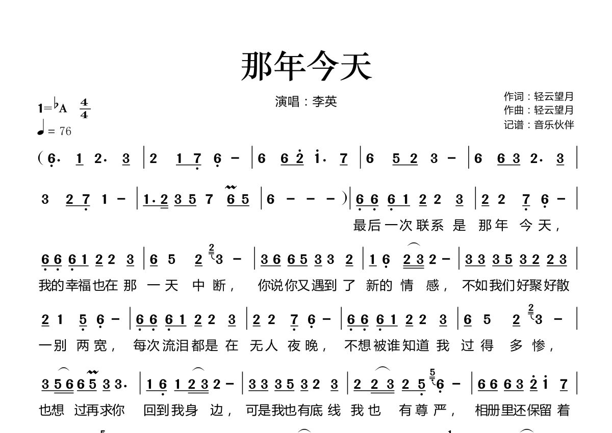 那年今天简谱 - 李英演唱