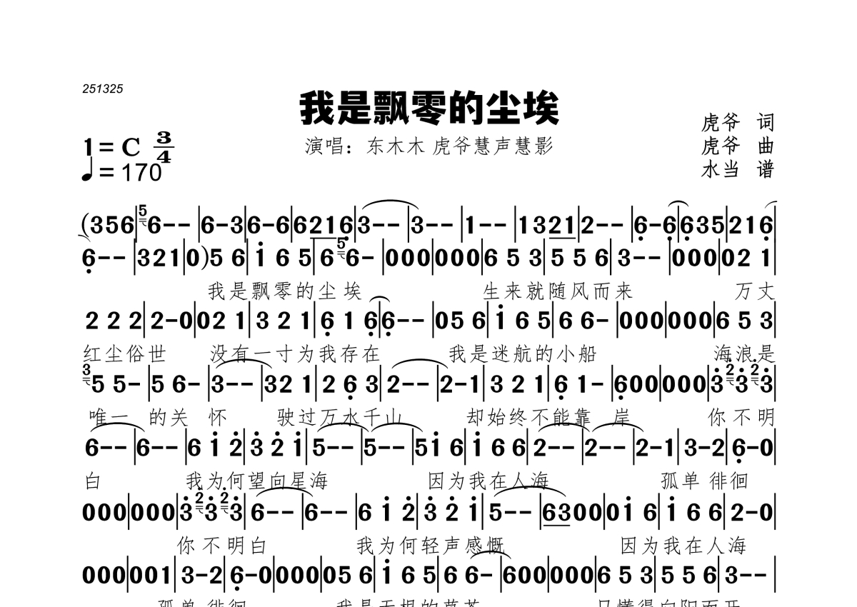 《我是飘零的尘埃》是东木木虎爷慧声慧影演唱的一首歌曲,拍号为4/4拍,歌曲速度为每分钟170拍,这份简谱共有一张高清图谱,图谱由 @水当 编配上传。