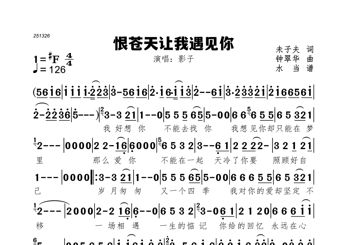 《恨苍天让我遇见你》是影子演唱的一首歌曲,拍号为4/4拍,歌曲速度为每分钟126拍,这份简谱共有一张高清图谱,图谱由 @水当 编配上传。
