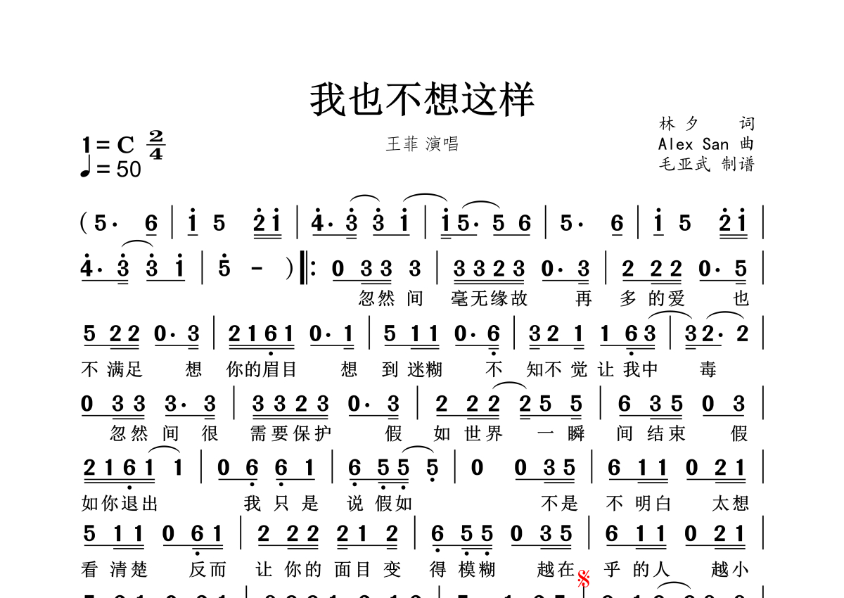 《我也不想这样》是王菲演唱的一首歌曲,拍号为2/4拍,这份简谱共有一张高清图谱,图谱由 @秋天的童话 编配上传。