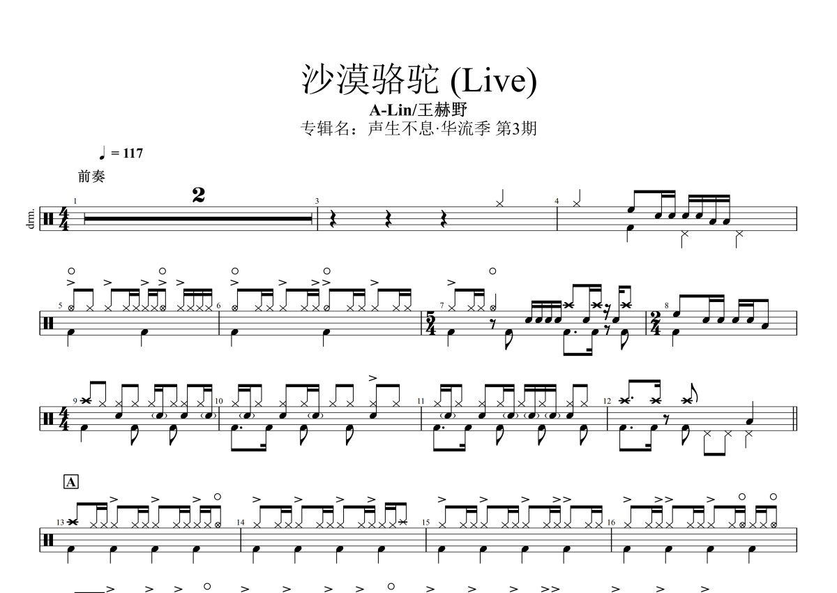 A-Lin/王赫野《沙漠骆驼 (Live)》架子鼓谱