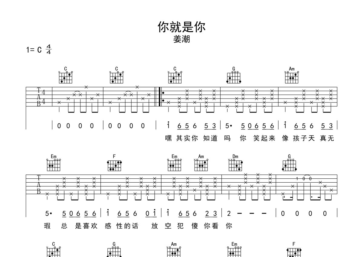 姜潮《你就是你》吉他谱 - C调弹唱六线谱
